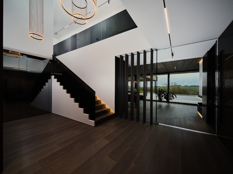 Der Bauherr wünschte sich eine warme, einladende Atmosphäre, geschaffen durch den Einsatz von natürlichen Materialien wie Holzdecken, Holzböden und Altholz. Diese Elemente sollten in einem spannungsvollen Dialog mit moderner Formensprache und großzügigen Glasflächen stehen.