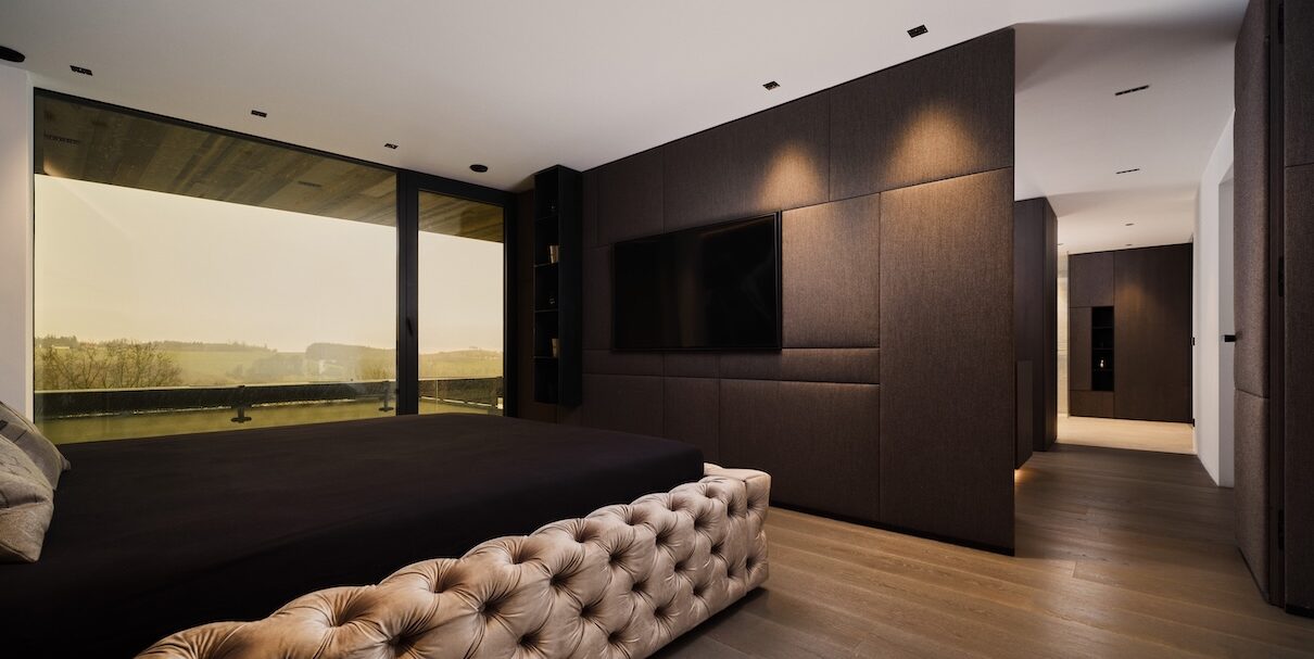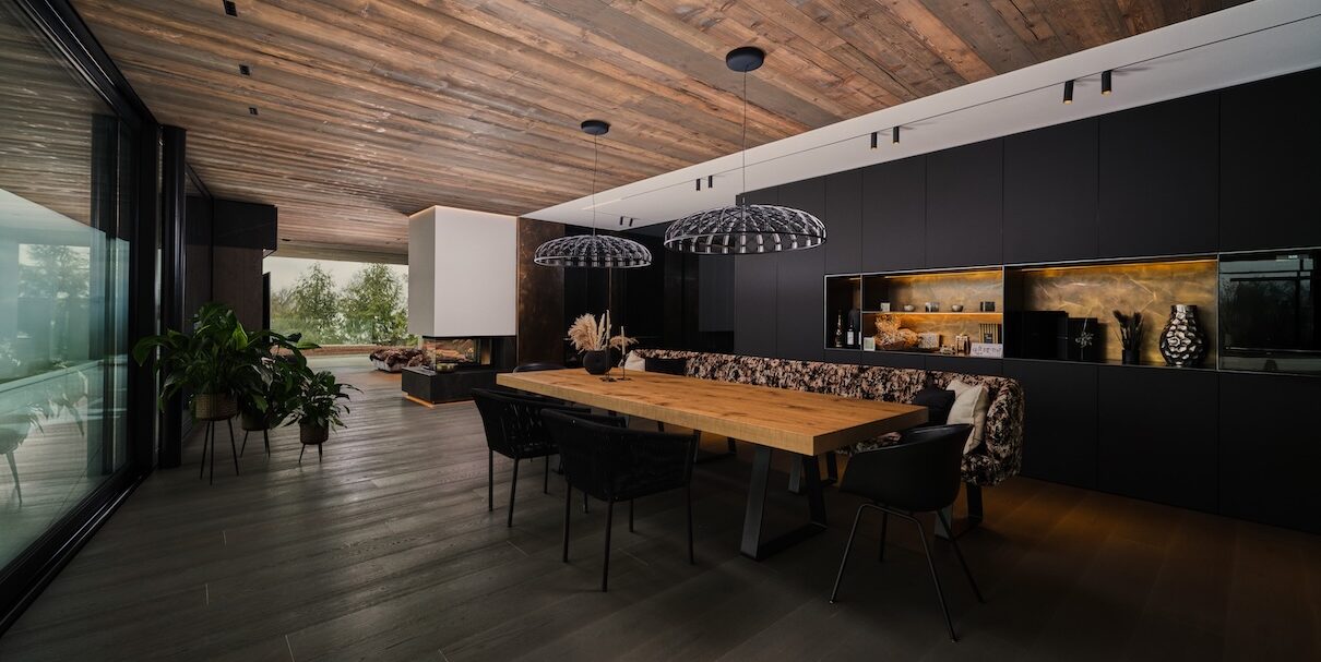 Die Aufgabe des Innenarchitekten bestand darin, ein sehr modernes, kubisches Wohnhaus in ein stilvolles Chalet zu verwandeln.